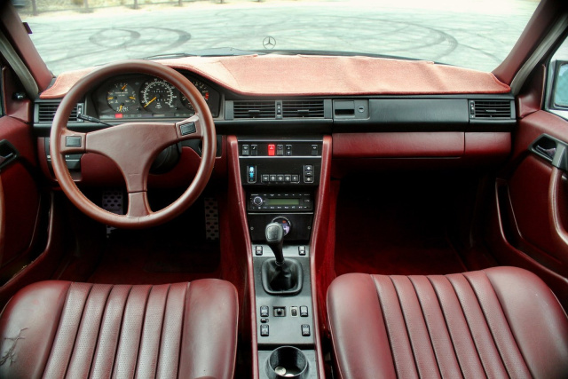 Lackiert in tiefem Schwarz (040) und kombiniert mit rotem MB-Tex-Interieur (177), trägt dieser 300E ein komplettes Zender-Karosseriepaket – Front- und Heckstoßfänger, Seitenschweller, Spoiler – alles im Original aus den 1990er Jahren. Dazu gesellen sich 500E-Scheinwerfer mit gelben Blinkern, eine schwarze Heckblende und bronzefarbene 15-Zoll-Zender-Felgen.