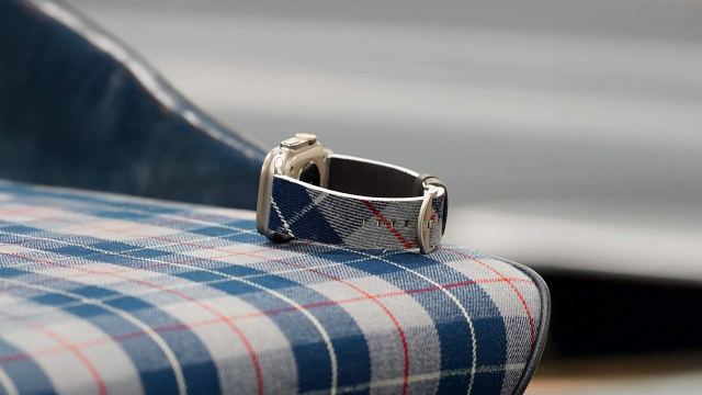 Genau dieses Detail greift die „Sonderedition Gullwing“ auf. Statt einfach nur „altes Leder“ zu recyceln, entschieden sich die Macher für die historisch korrekten Stoffe aus der berühmten Sattlerei von HK-Engineering. Das Ergebnis ist ein Armband in den ikonischen blau-grauen oder rot-grauen Karomustern. Es ist ein Design-Zitat, das Kenner sofort als Referenz an die deutsche Wirtschaftswunder-Ära identifizieren, während es haptisch einen warmen Kontrast zum kühlen Gehäuse der Smartwatch bildet.